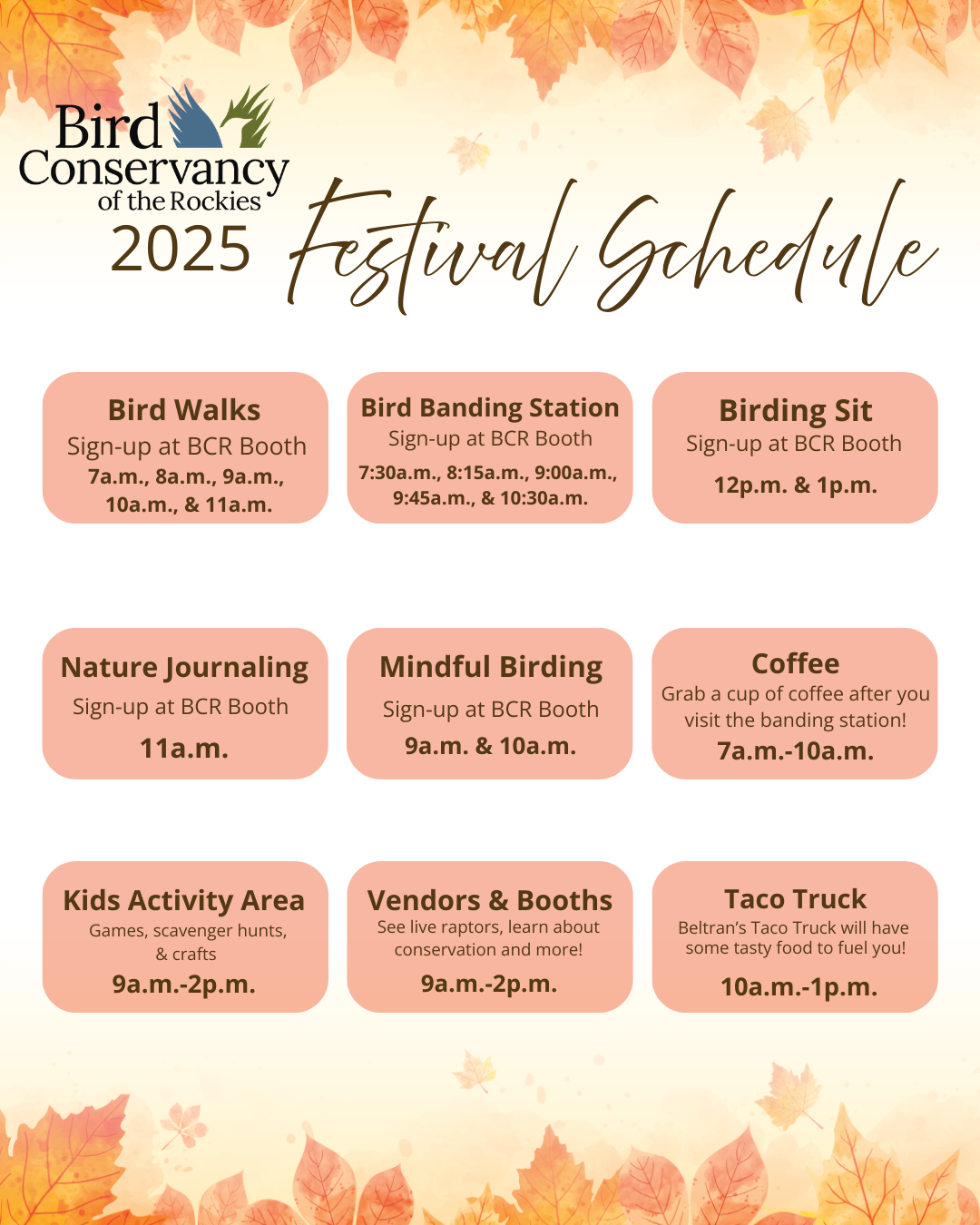 Bird Conservancy’s Fall Birding Festival at Barr Lake State Park is a must attend for anyone interested in birding, nature, or time outside with the family. People of all ages and abilities can see birds up close at the bird banding station, experience a mindful bird walk, visit educational booths, and have fun with family friendly games and activities. We will also have a coffee cart and a food truck this year!